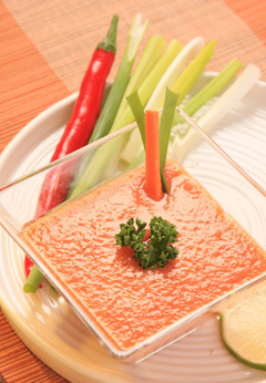 新鮮番茄有強力抗氧化性可延遲老化、防癌、預防心血管疾病,還有高鉀可利尿清熱降壓。又選用藕粉來勾芡成黏稠狀,主要考量藕粉比起其他精緻澱粉(樹藷粉或太白粉)除了供給澱粉外,還有部份它種營養素存在(如鐵質),讓您烤肉也要吃的健康。